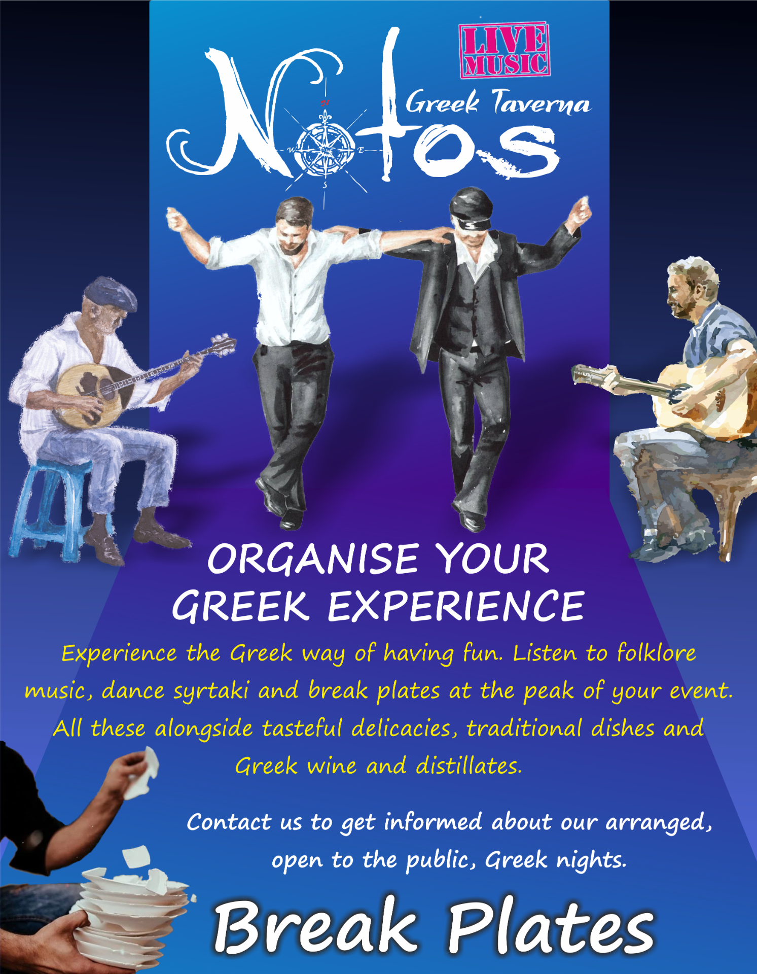 With much love and respect for our tradition, we created dishes inspired by places around Greece. Homemade dishes, original recipes prepared with pure and fresh ingredients by local producers. Local meats, fresh fish and a big variety of delicacies that will satisfy even the most demanding connoisseurs. Every week our musicians will keep you company with traditional Greek music.